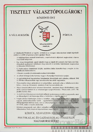 Vállalkozók Pártja választás országgyűlési választás szavazás pártprogram plakát 1990Fotó részletei