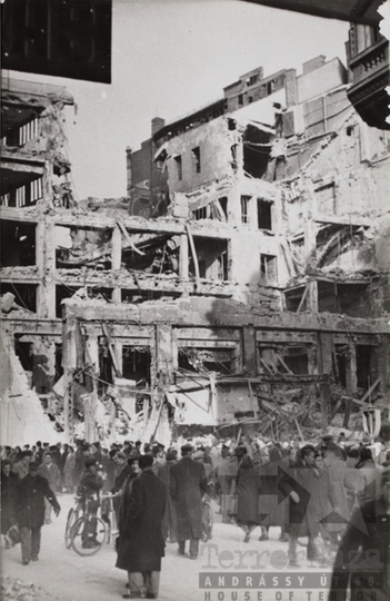 Járókelők és biciklizők a Magyar Divatcsarnok (később Otthon Áruház) romjainál a Rákóczi úton.