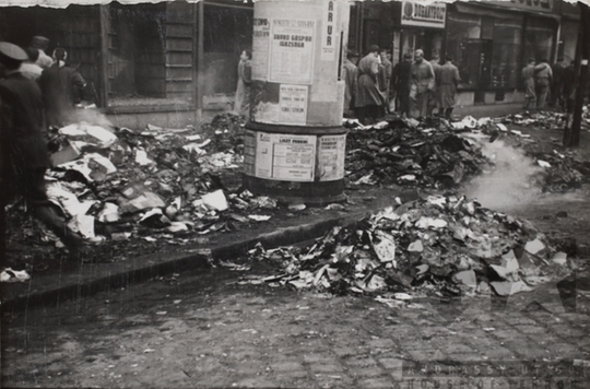 Szovjet és kommunista propaganda könyvek és újságok égésmaradványai a Nagykörút és a Dohnányi Ernő (egykor Szófia) utca sarkán álló Horizont könyvesboltnál.