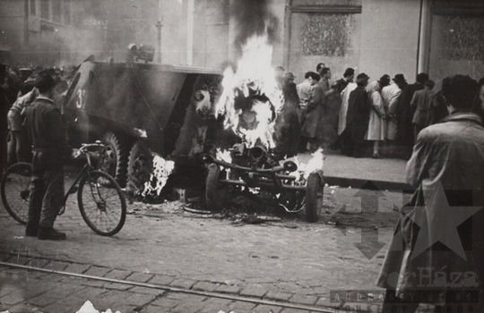 utcakép harckocsi szovjet BTR-152 harcjármű felkelő kerékpár Rákóczi út Akácfa utca Budapest Tomecskó FrigyesFotó részletei