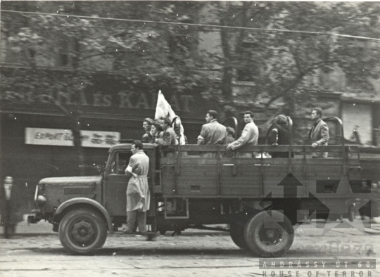 Forradalmárok egy Csepel D-350-es teherautón. A háttérben ruhabolt felirata: Férfiruha és kabát.