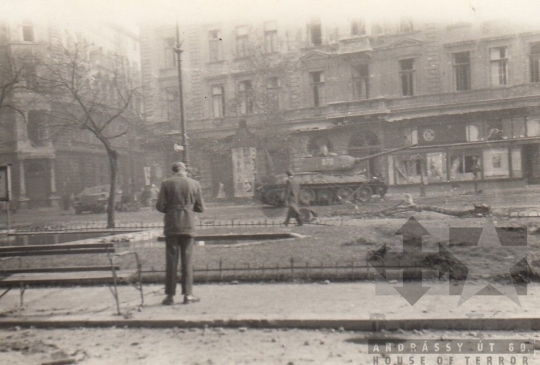szovjet T-34/85 harckocsi BTR-152 harcjármű roncs utcakép József körút BudapestFotó részletei