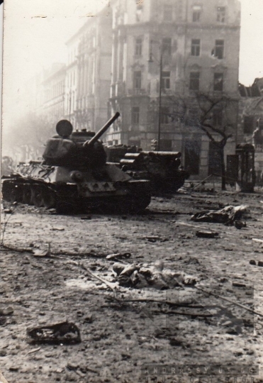 Kilőtt szovjet T-34/85 harckocsi és egy harcképtelen ISZU-152-es önjáró löveg a József körúton a Corvin köznél. Háttérben a Ferenc körút 44. szám romos épülete.