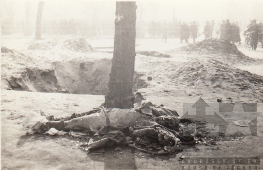 Meglincselt tiszt holtteste a Köztársaság téri pártház ostroma után a földalatti kazamaták előtt.